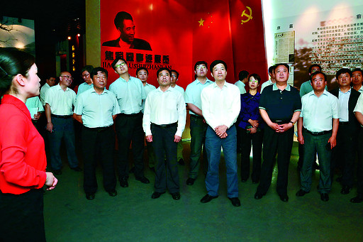 5月24日,在蘭考縣焦裕祿同志紀念館內,市委書記魏小東(前排右三)、市長范修芳(前排右四)等認真聆聽講解員的講解。