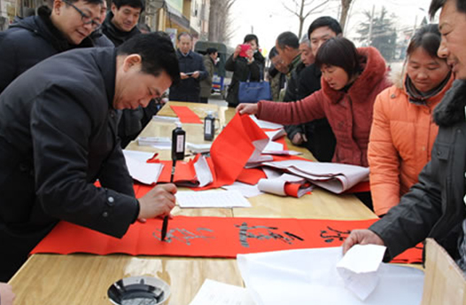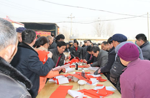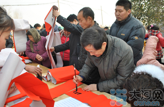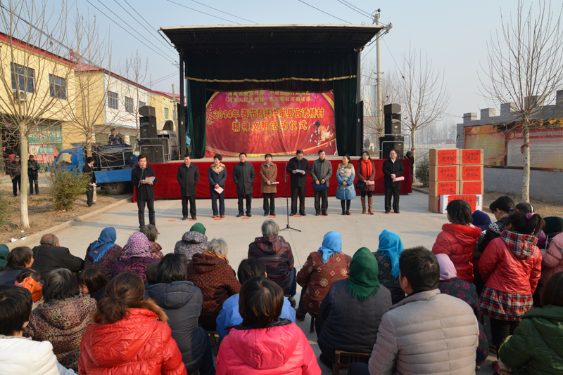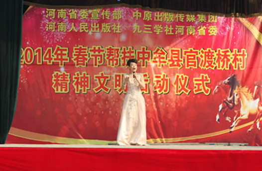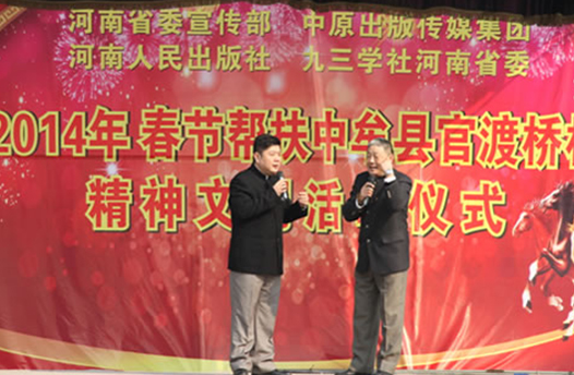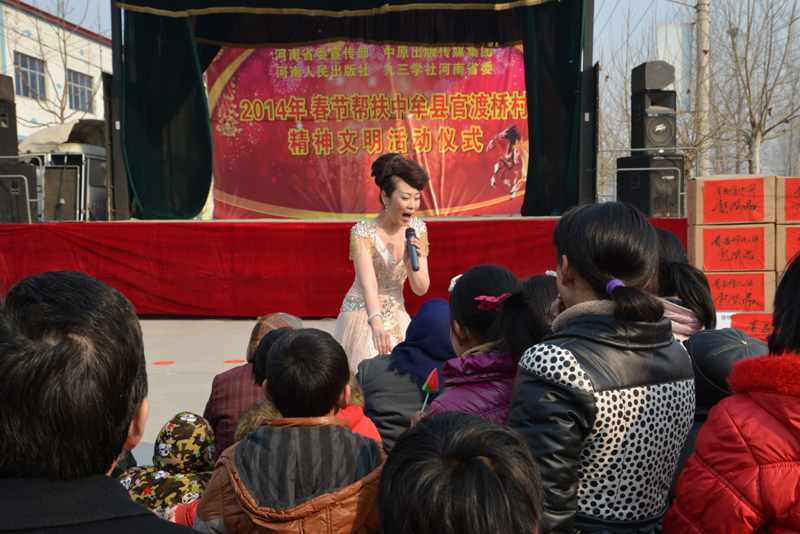 省委宣傳部副巡視員杜瑞明代表省直四家單位講了話,向官渡橋村村民送上節日的祝福。隨后,慰問團的領導向官渡橋村農民群眾和小學生贈送了文體用品。由省委宣傳部邀請的薛青、郝曉冬等省內多位知名演員為村民們表演了歌舞《田野里的春天》、豫劇《朝陽溝》選段、相聲《大腕研究》、嗩吶《百鳥朝鳳》等七個精彩的節目。在近兩個小時的演出中,臺上演員們精彩的表演,博得群眾的陣陣掌聲。省委宣傳部機關黨委專職副書記李憲林、創建處處長張德偉揮毫潑墨,現場為鄉親們義寫春聯。省九三學社邀請的省醫療專家為鄉親們傳播健康衛生知識,現場檢查治療。中原出版集團和河南人民出版社為鄉親們贈送了科技圖書讓大家過春節時學習,整個慰問活動場面熱烈,氛圍濃厚。